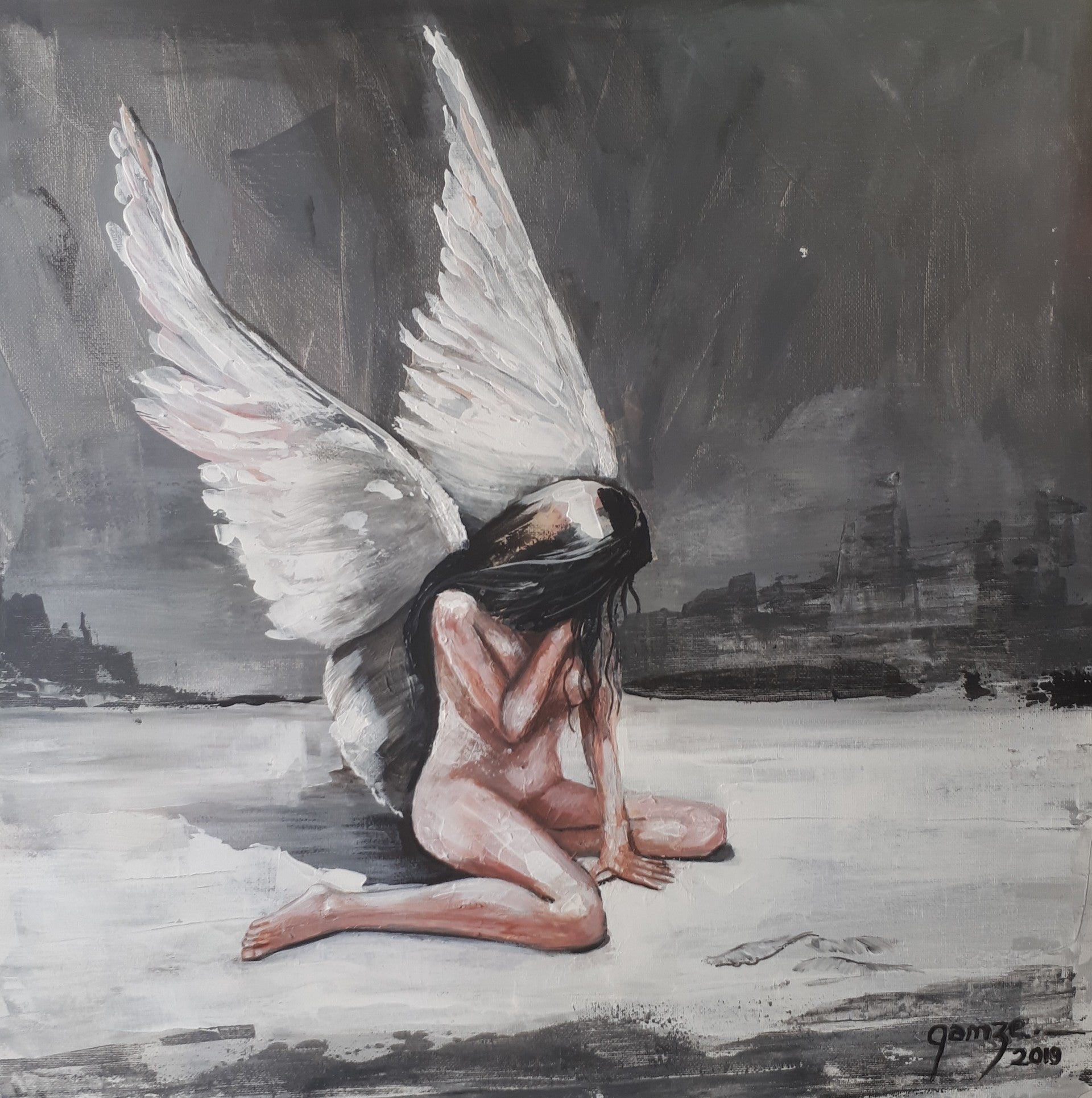 Dit schilderij is een van de schilderijen die ik heb gemaakt met gebruik van minder kleur en detail. Ik heb een abstracte achtergrond gemaakt met een paletmes. Dit weerspiegelt een skyline van de stad als je goed kijkt. De voorgrond wordt gecompleteerd met een engelenbeeld dat ik een beetje abstract en een beetje realistisch probeer af te beelden. Als ik werd gezonden om in deze wereld te leven als een engel ... Zou ik huilen of lachen om wat ik zie en voel?